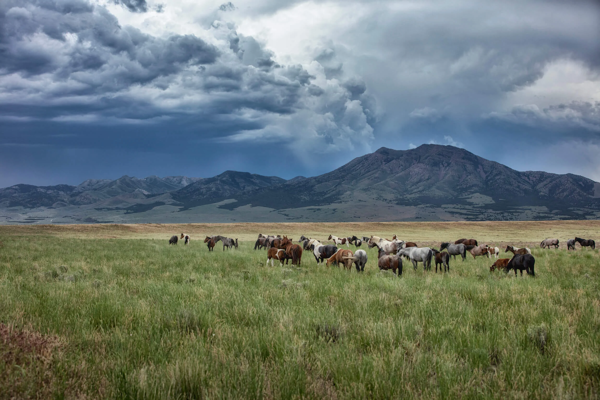 Under this dramatic and foreboding sky, the horses continued to graze peacefully. However, as the first distant claps of thunder echoed through the air, accompanied by the subtle patter of raindrops, a subtle restlessness stirred among the horses. As the rain intensified, changing from a gentle drizzle to a relentless downpour, the herd's grazing transformed into a sudden burst of energy, and they vanished into the veil of rain.